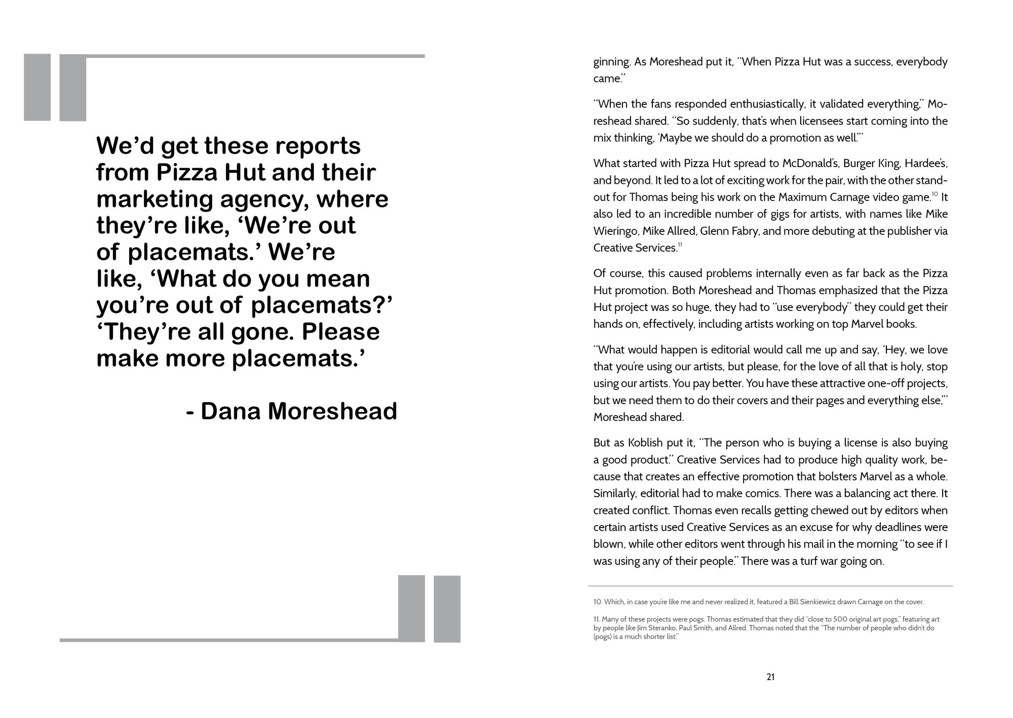 The book is 108 pages, A5 sized, with interiors printed on 80 lb uncoated paper and a 110 lb soft-touch laminated cover. It's perfect bound, and comes with original art from artist Tadd Galusha, whose work introduces all five of the articles. It also contains art from The Wicked + The Divine for The Art of the Page Turn and one of the ads from the Pizza Hut x X-Men collaboration. My goal is to include some bonuses in there as well.
